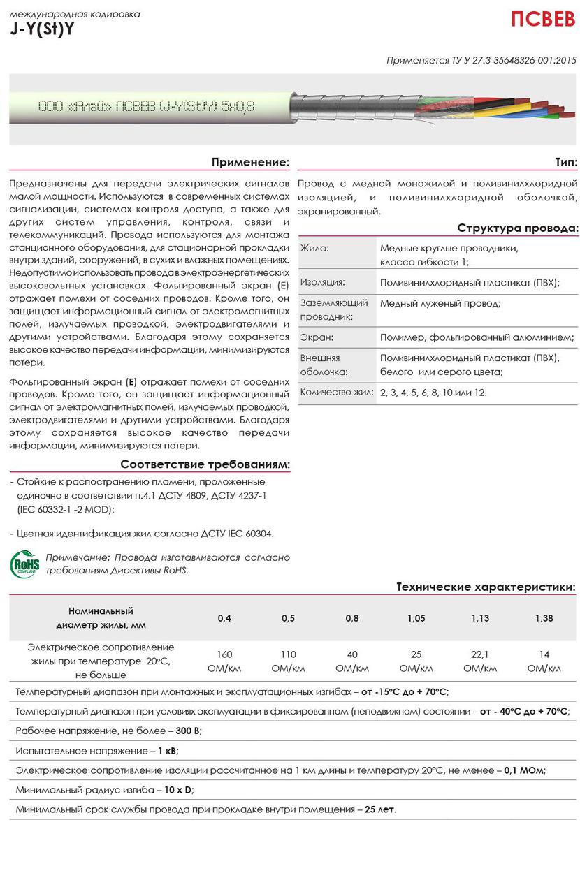 Провод ПСВЭВ — це кабель із мідними струмопровідними жилами в екрані, який призначається для передавання електричних імпульсів слабкої потужності в системах зв'язку та телекомунікацій, а також у системі охоронної або пожежної безпеки. Може використовуватися як для стаціонарної внутрішньої, так і зовнішньої прокладки.Підпиписи: